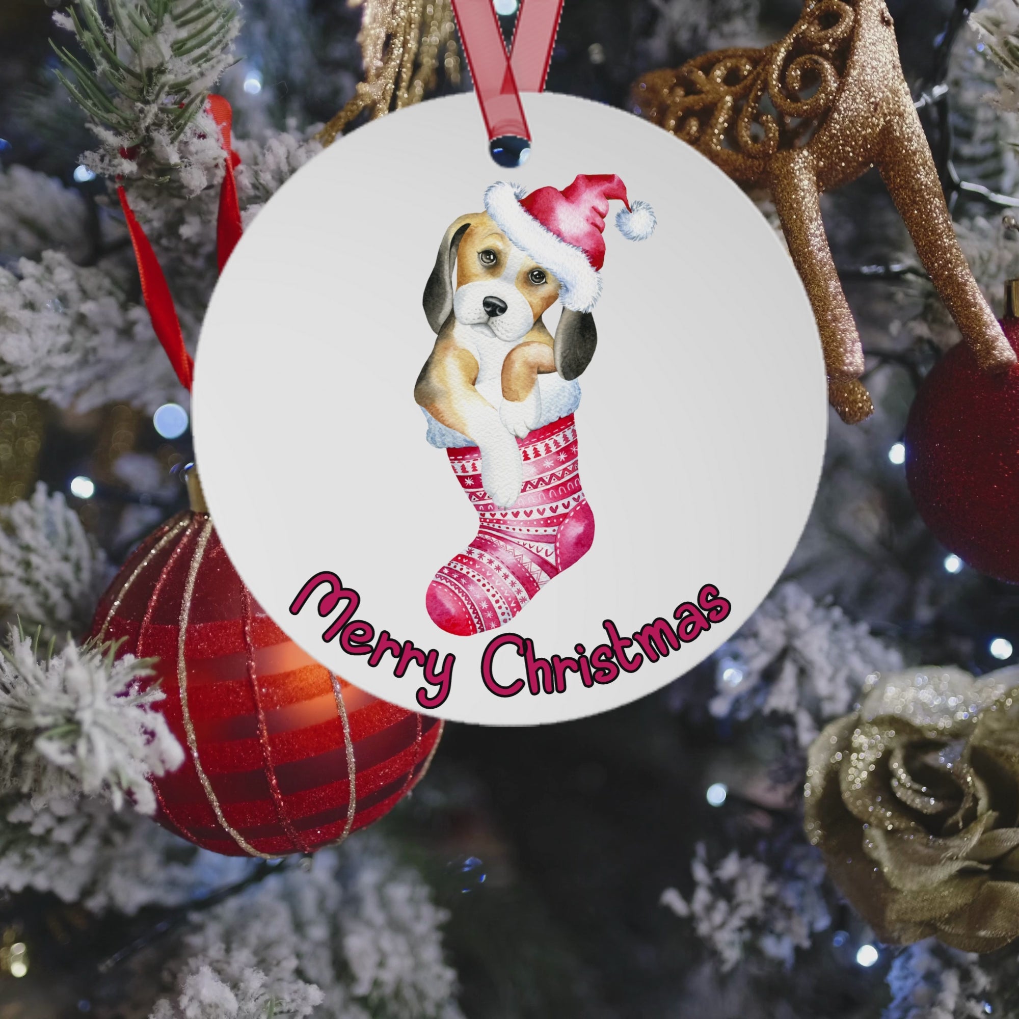 Our adorable beagle is all warm and cozy snuggled in a stocking. This is a metal christmas tree ornament which is durable and will bring holiday cheer for years to come. The design is printed on both sides of the white aluminum base with a glossy finish. The surface is scratch and chip-resistant, and it comes with a red ribbon for hanging. .: White aluminum base with a glossy finish .: Scratch and chip resistant surface .: Printed on both sides .: Each ornament comes with a red ribbon for hanging .: Round ornaments are 3.50" x 3.50"
