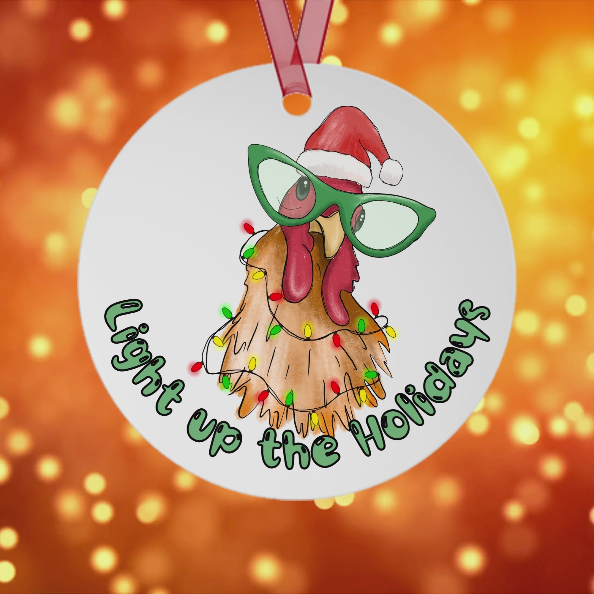Our chicken is wrapped in christmas lights, a santa hat and trendy green glasses and reminds us to "Light Up the Holidays". This is a metal christmas tree ornament which is durable and will bring holiday cheer for years to come. The design is printed on both sides of the white aluminum base with a glossy finish. The surface is scratch and chip-resistant, and it comes with a red ribbon for hanging. .: White aluminum base with a glossy finish .: Scratch and chip resistant surface .: Printed on both sides .: Each ornament comes with a red ribbon for hanging .: Round ornaments are 3.50" x 3.50"