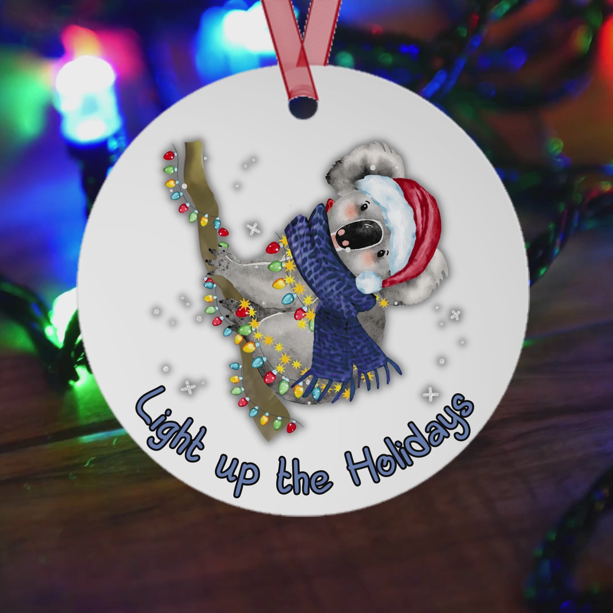 Our cute ornament features a koala wearing a scarf and hat reminding you to "Light Up the Holidays". This is a metal christmas tree ornament which is durable and will bring holiday cheer for years to come. The design is printed on both sides of the white aluminum base with a glossy finish. The surface is scratch and chip-resistant, and it comes with a red ribbon for hanging. .: White aluminum base with a glossy finish .: Scratch and chip resistant surface .: Printed on both sides .: Each ornament comes with a red ribbon for hanging .: Round ornaments are 3.50" x 3.50"