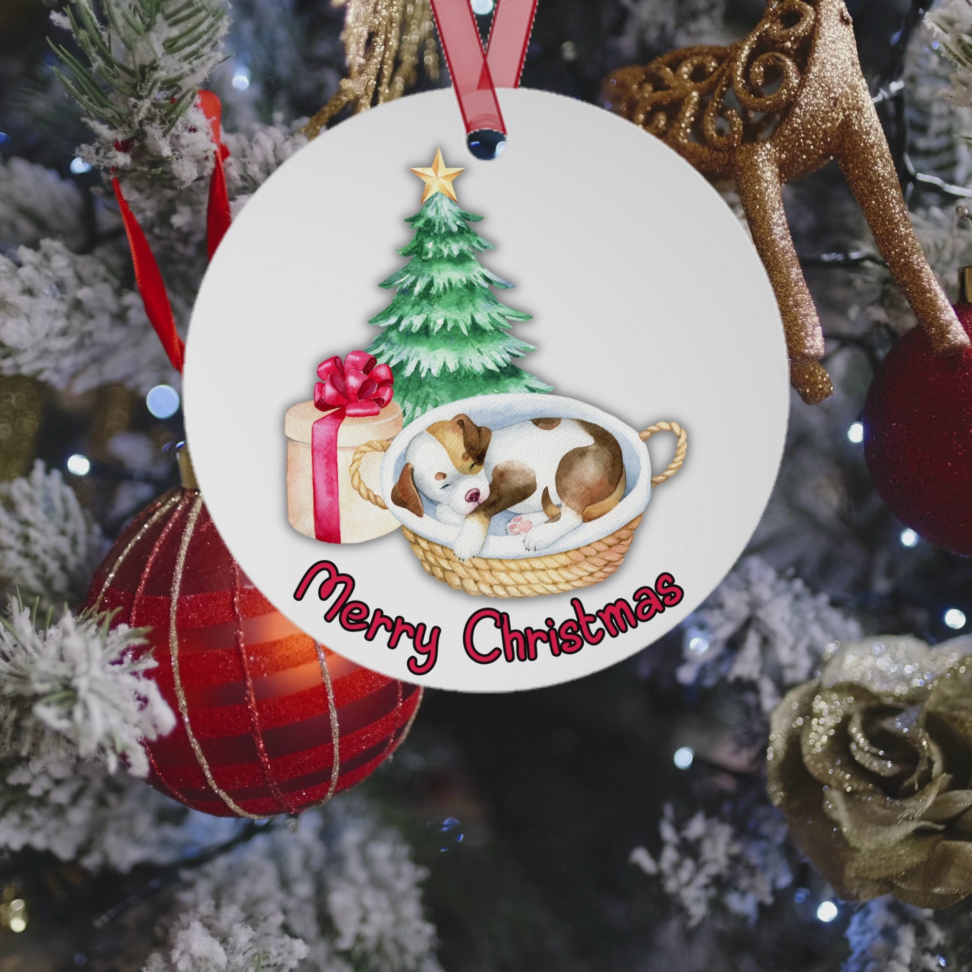 Our adorable puppy is resting in a basket under a Christmas tree and has the timeless message to have a "Merry Christmas". This is a metal christmas tree ornament which is durable and will bring holiday cheer for years to come. The design is printed on both sides of the white aluminum base with a glossy finish. The surface is scratch and chip-resistant, and it comes with a red ribbon for hanging. .: White aluminum base with a glossy finish .: Scratch and chip resistant surface .: Printed on both sides .: Each ornament comes with a red ribbon for hanging .: Round ornaments are 3.50" x 3.50"