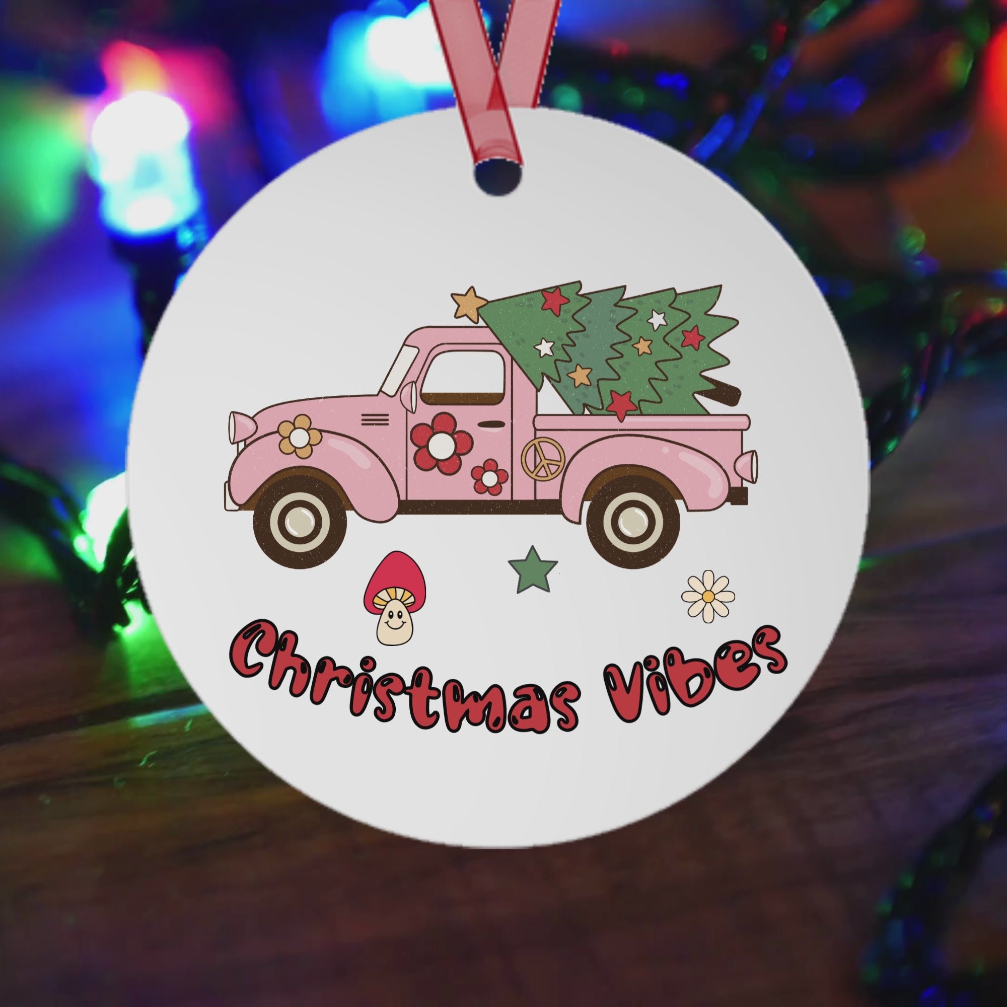 Our pink retro truck wishes you peace, happiness, and positive "Christmas Vibes". This is a metal christmas tree ornament which is durable and will bring holiday cheer for years to come. The design is printed on both sides of the white aluminum base with a glossy finish. The surface is scratch and chip-resistant, and it comes with a red ribbon for hanging. .: White aluminum base with a glossy finish .: Scratch and chip resistant surface .: Printed on both sides .: Each ornament comes with a red ribbon for hanging .: Round ornaments are 3.50" x 3.50"