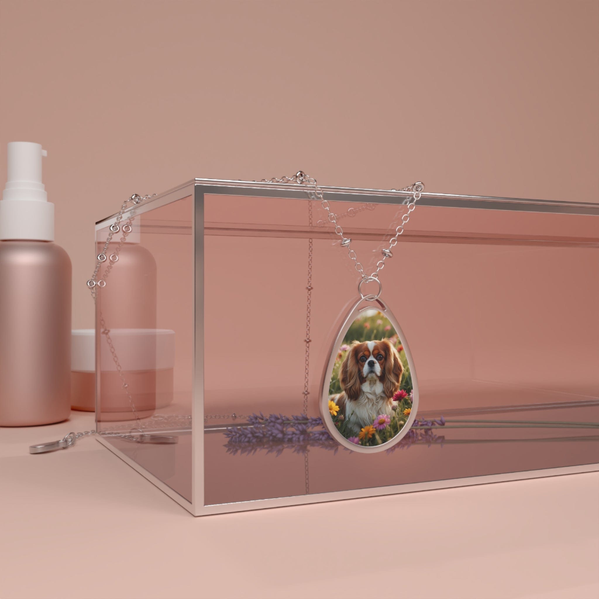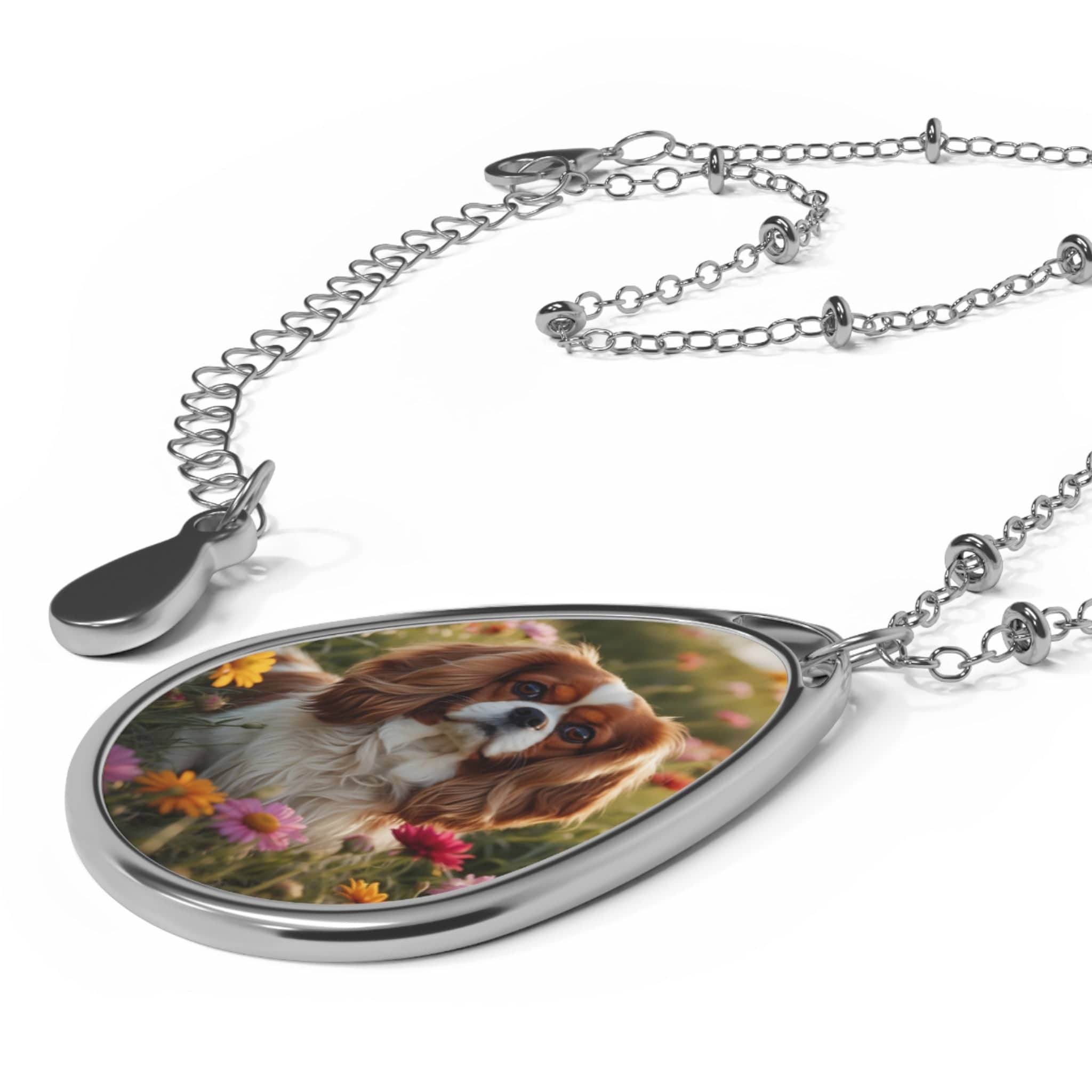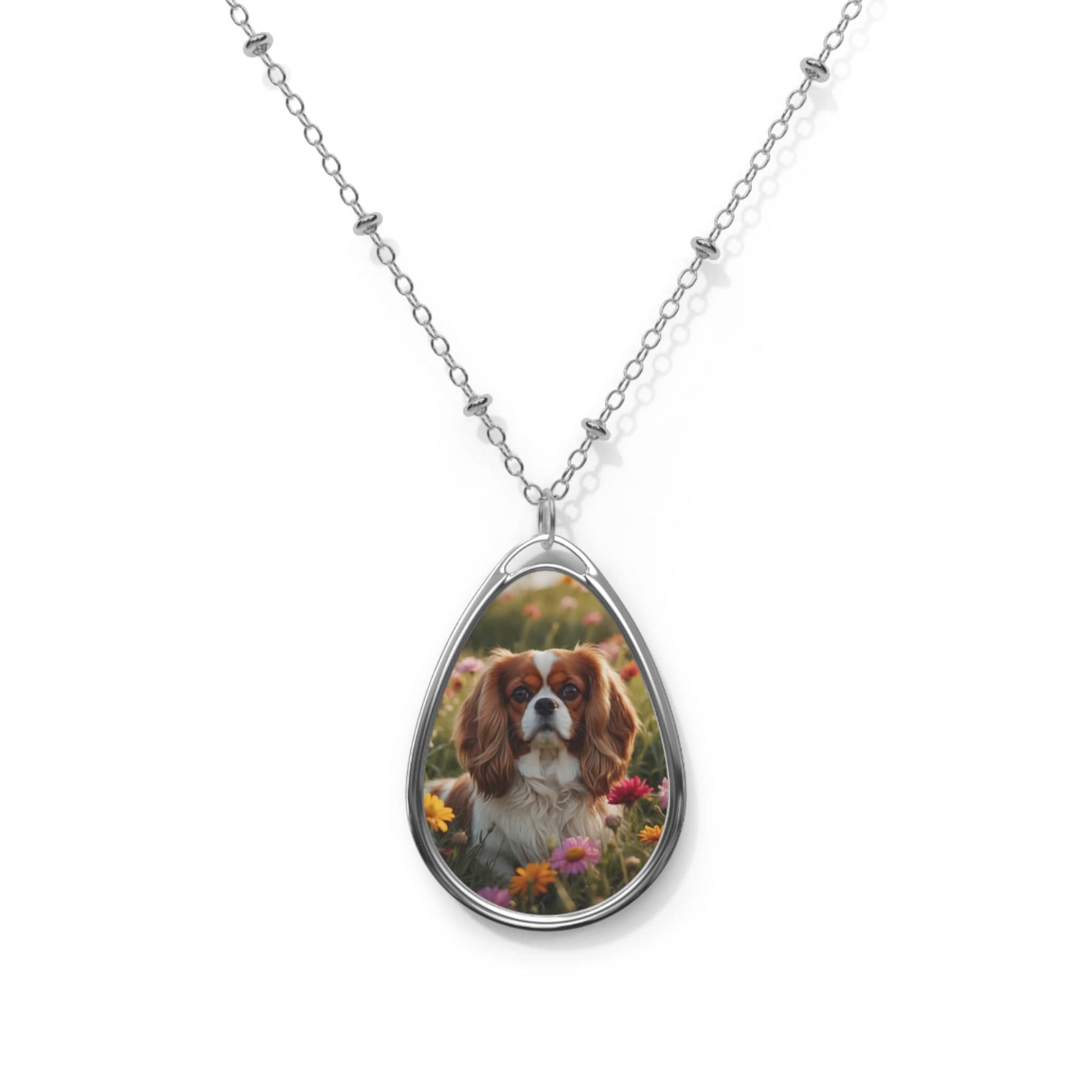 This elegant teardrop-shaped necklace features a high-quality image of a sweet Blenheim Cavalier nestled in a field of vibrant spring wildflowers. It captures the gentle expression and soulful eyes that make this breed so beloved.