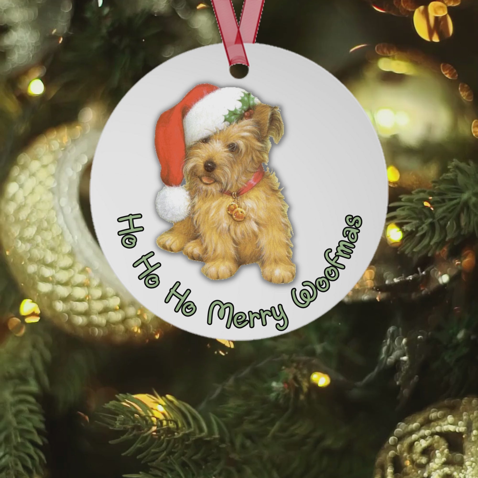 Our adorable dog has a santa hat and wishes you a "Merry Woofmas". This is a metal christmas tree ornament which is durable and will bring holiday cheer for years to come. The design is printed on both sides of the white aluminum base with a glossy finish. The surface is scratch and chip-resistant, and it comes with a red ribbon for hanging. .: White aluminum base with a glossy finish .: Scratch and chip resistant surface .: Printed on both sides .: Each ornament comes with a red ribbon for hanging .: Round ornaments are 3.50" x 3.50"