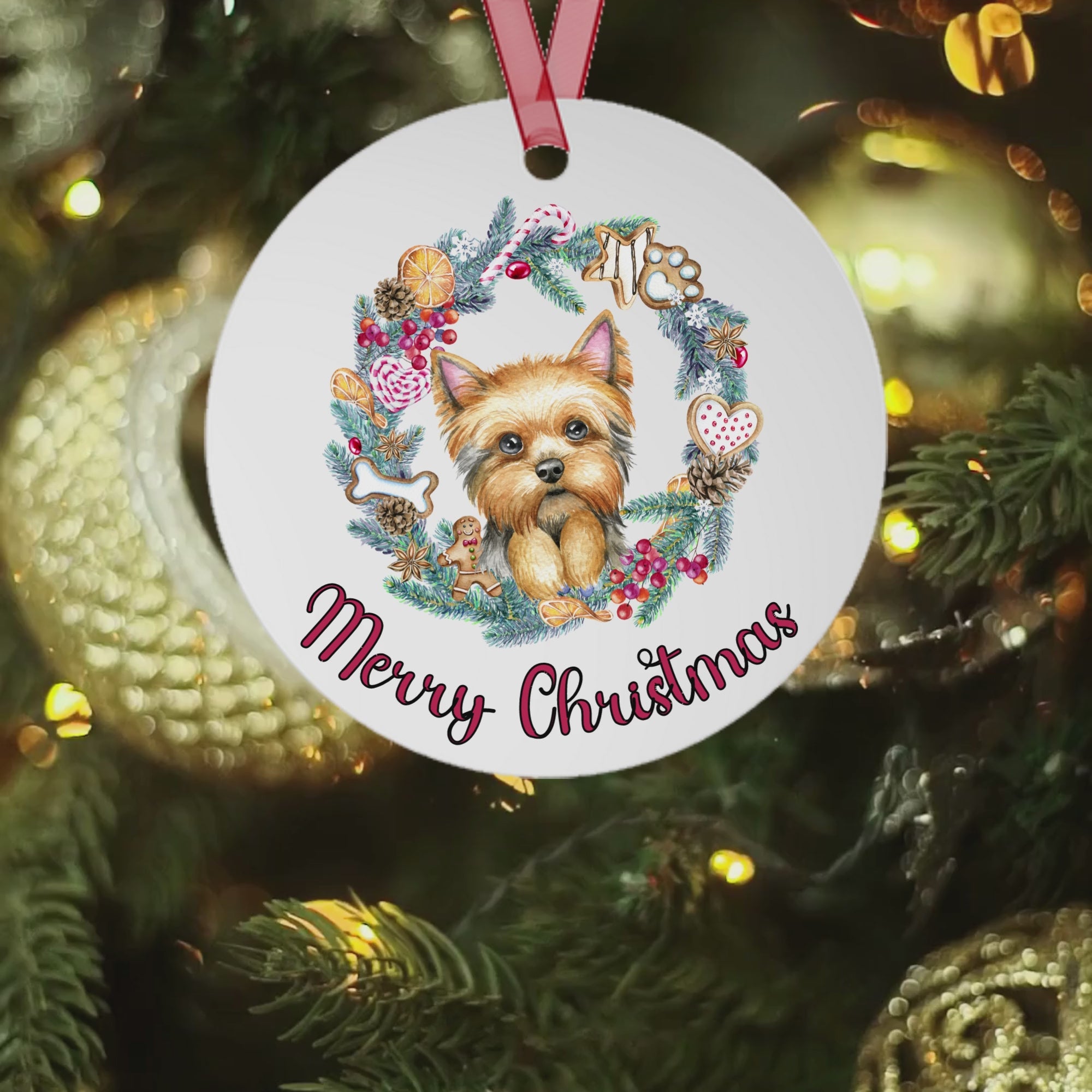 Our adorable yorkie is surrounded by a beautiful wreath. This is a metal christmas tree ornament which is durable and will bring holiday cheer for years to come. The design is printed on both sides of the white aluminum base with a glossy finish. The surface is scratch and chip-resistant, and it comes with a red ribbon for hanging. .: White aluminum base with a glossy finish .: Scratch and chip resistant surface .: Printed on both sides .: Each ornament comes with a red ribbon for hanging .: Round ornaments are 3.50" x 3.50"